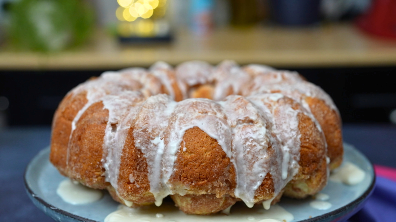 - Once the monkey bread is done baking, remove it from the oven and let it cool in the pan for 5-10 minutes. Invert the monkey bread onto a serving platter and drizzle the glaze over the top.