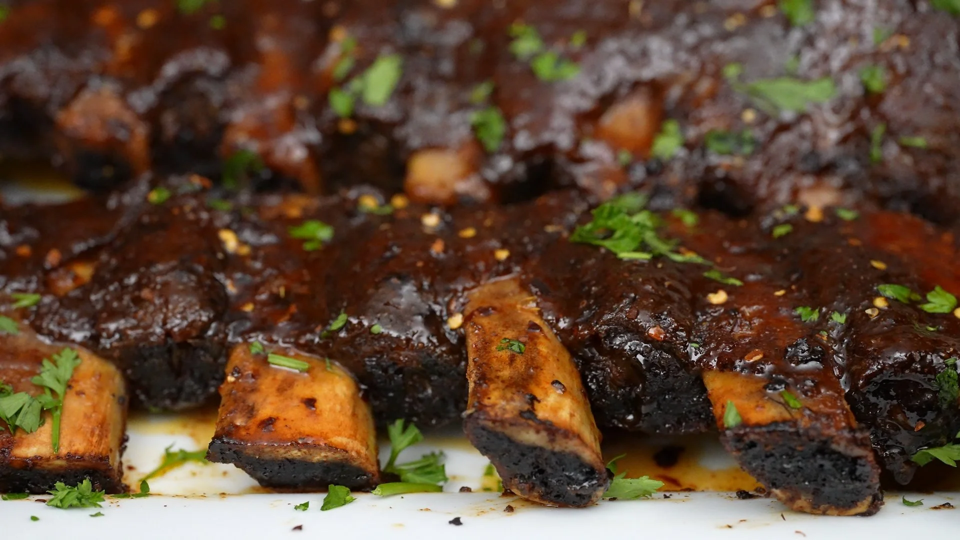 Slice between bones, drizzle more hot honey glaze, and garnish with chili flakes + fresh parsley.